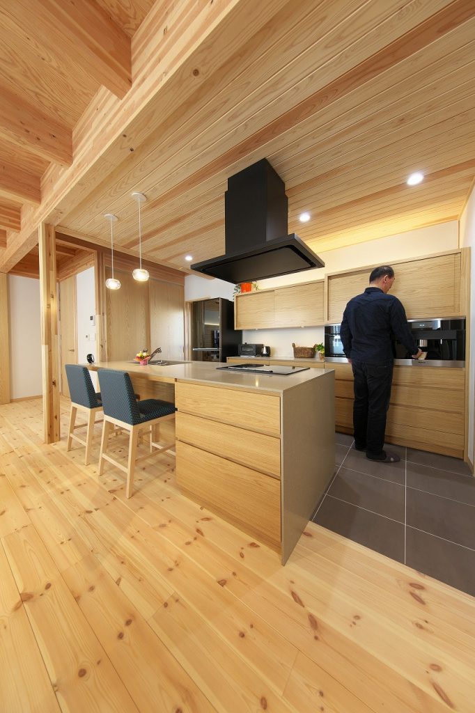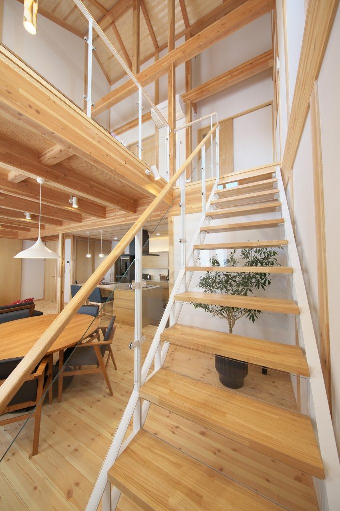 そこに控えめに存在感を主張する白い鉄骨のスケルトン階段と内装に合わせてコーディネートしたフルオーダーの家具とキッチンが和モダンな雰囲気と調和します。